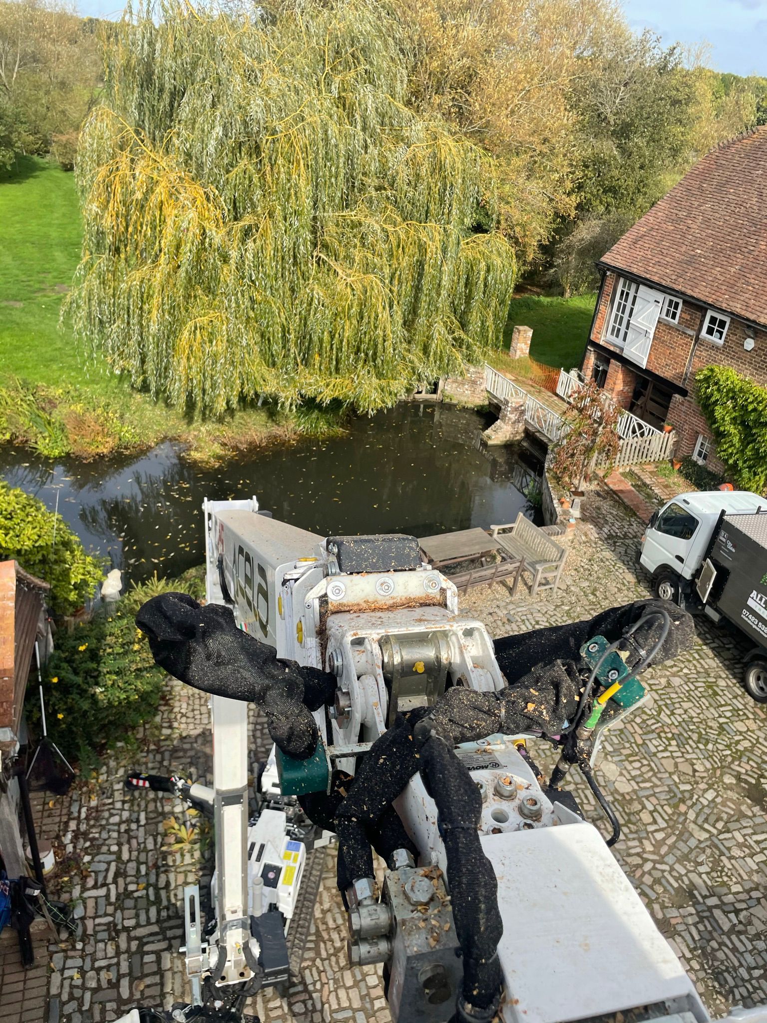 Tree felling and dismantling involve the skilful and controlled removal of trees, typically in confined spaces or urban environments, ensuring safety and minimizing impact on surrounding structures.